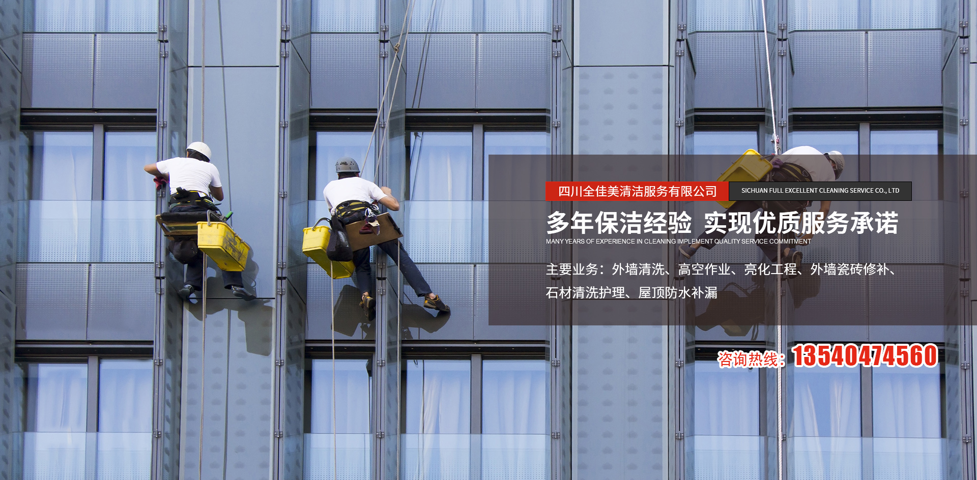 四川全佳美清潔服務(wù)有限公司成立于2017年11月20日,注冊(cè)資本200萬元人民幣,是一家專業(yè)從事高空外墻清洗,外墻維修,開荒保潔,石材養(yǎng)護(hù),外墻防水等一體化的工程服務(wù)公司。公司先后服務(wù)于成都鐵路培訓(xùn)學(xué)校,雙流空港酒店,省體育館等寫字樓及工業(yè)園區(qū)的外墻清洗保潔及維修服務(wù)。經(jīng)過多年的發(fā)展與努力,公司已具備一定的規(guī)模及實(shí)力。現(xiàn)擁有一支技術(shù)精湛的服務(wù)團(tuán)隊(duì),以高標(biāo)準(zhǔn)的服務(wù)品質(zhì),專業(yè)的安全技術(shù)實(shí)力,為全川不同群體的客戶提供更安全,更周到的清洗服務(wù)解決方案,期待與你的合作。
